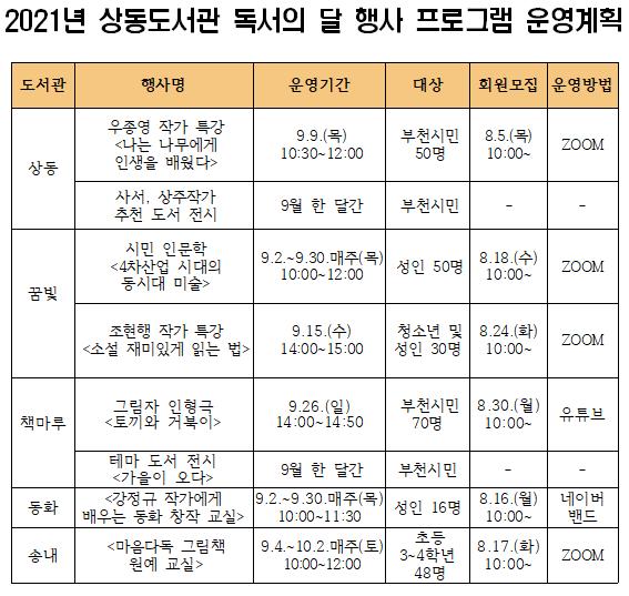 ºÎõ½Ã¸³µµ¼­°üÀº 9¿ù µ¶¼­ÀÇ ´ÞÀ» ¸ÂÀÌÇÏ¿© ´Ù¾çÇÑ µ¶¼­¹®È­ÇÁ·Î±×·¥À» ¸¶·ÃÇß´Ù. À̹ø Çà»ç´Â Äڷγª19 È®»ê ¹æÁö¸¦ À§ÇØ ZOOM, ³×À̹ö ¹êµå µî ¿Â¶óÀÎ Ç÷§ÆûÀ» Ȱ¿ëÇÏ¿©..
